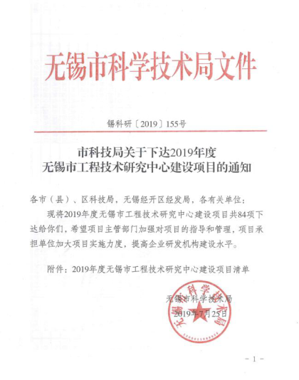 無錫市科學(xué)技術(shù)局文件:錫科研【2019】155號(hào)文,關(guān)于下達(dá)2019年度無錫市工程技術(shù)研究中心建設(shè)項(xiàng)目的通知,江蘇新合益機(jī)械有限公司獲得“無錫市高強(qiáng)度精密活塞桿工程技術(shù)研究中心”稱號(hào),此項(xiàng)目成功獲批是新合益積極推進(jìn)企業(yè)自主創(chuàng)新能力建設(shè)加速科技基礎(chǔ)平臺(tái)建設(shè)所取得的又一成果。